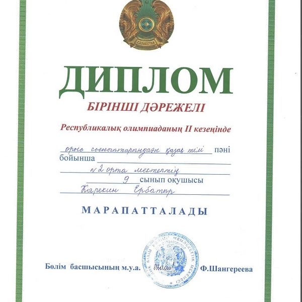 6,7 Желтоқсан аралығында Республикалық олимпиада өткізілді. Жалпы білім беретін #2 Жүмекен Нәжімеденов атындағы орта мектептің 9 сынып оқушысы Карякин Ербатыр орыс сыныптарындағы қазақ тілі пәні бойынша жүлделі І орын иеленді.
