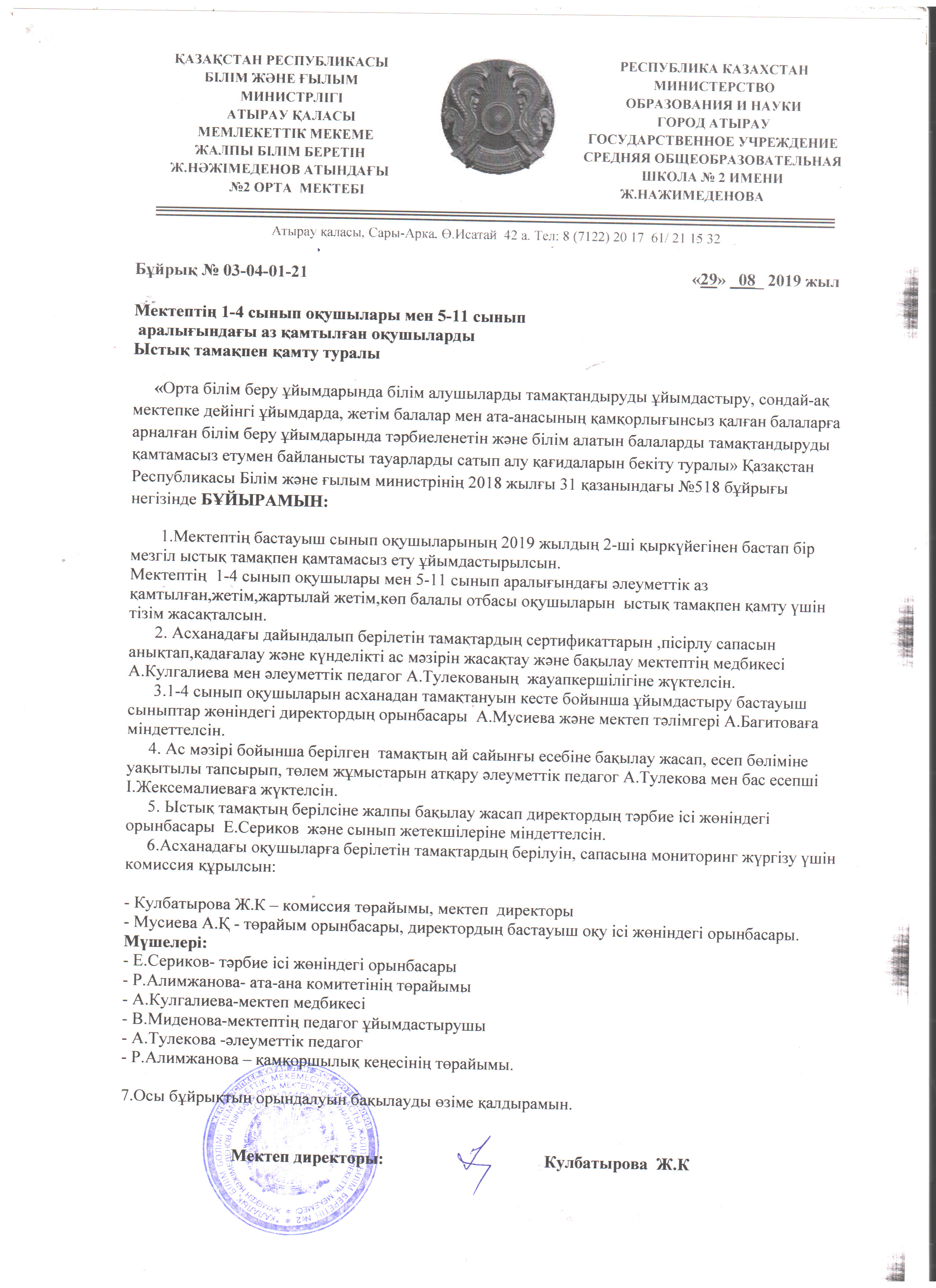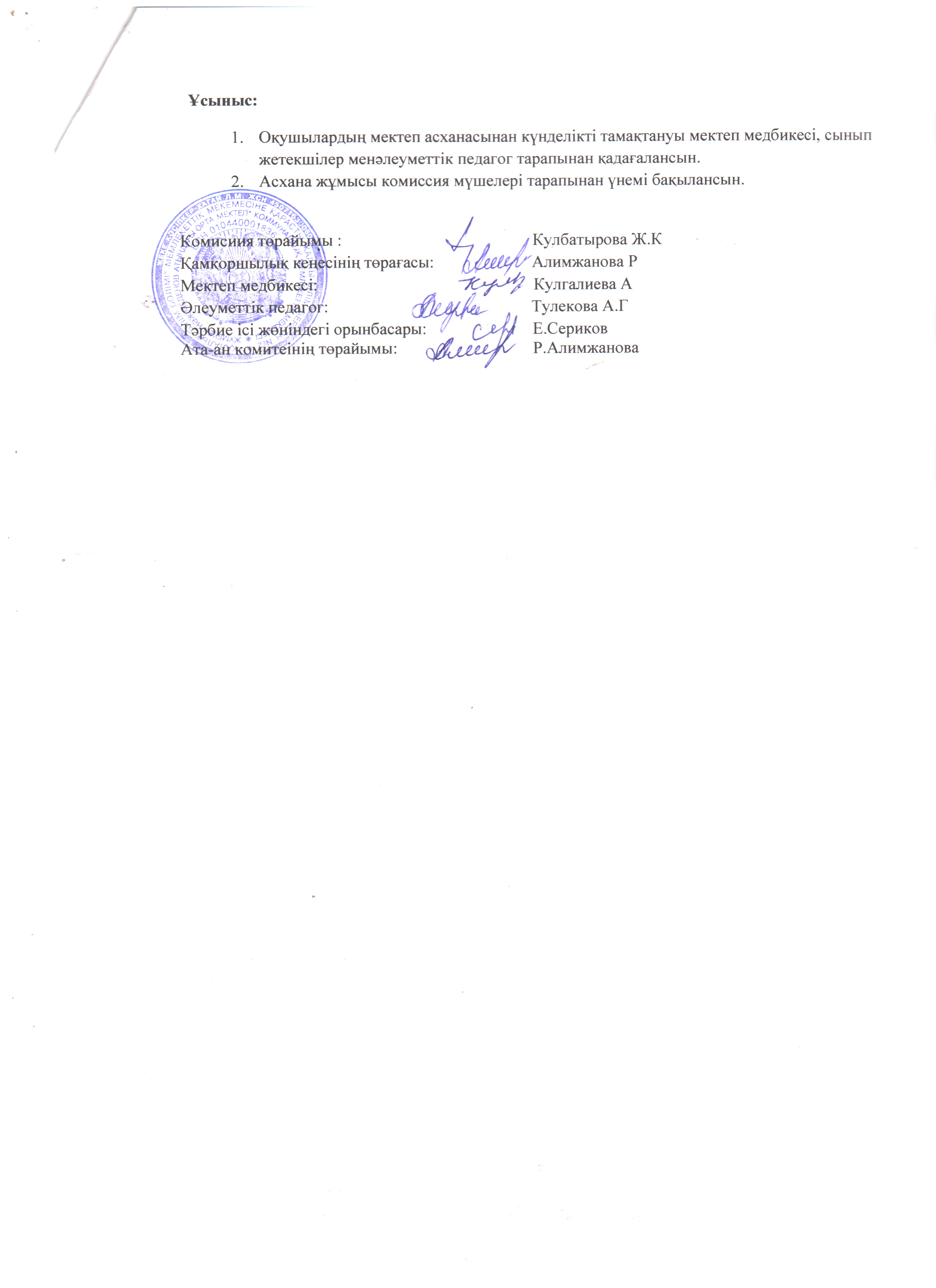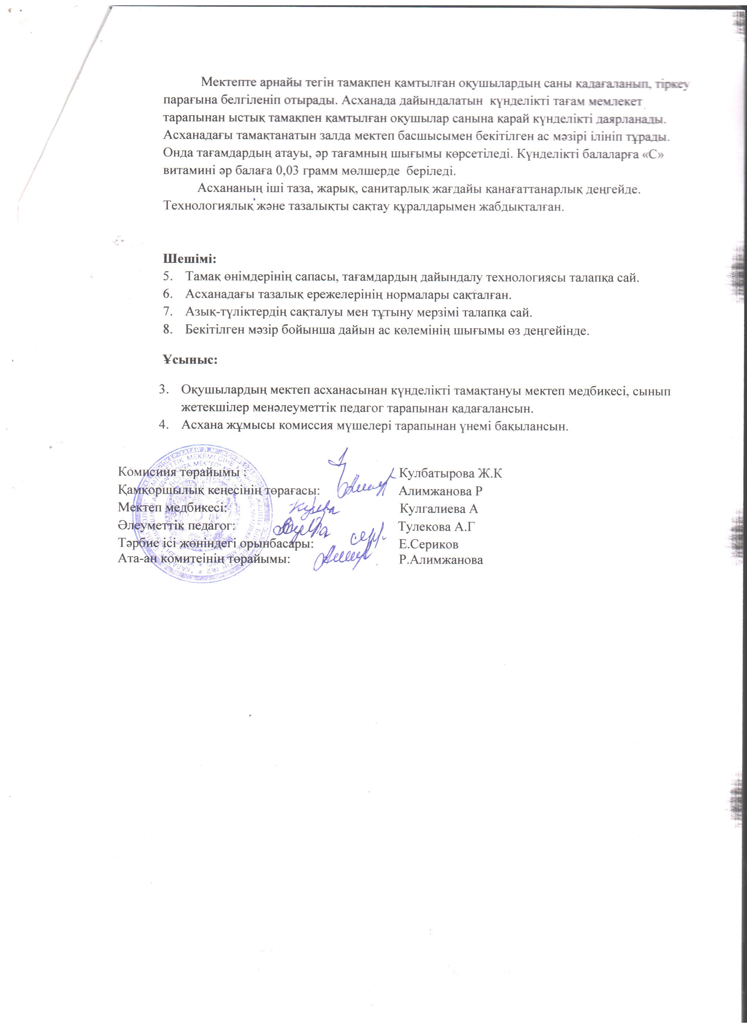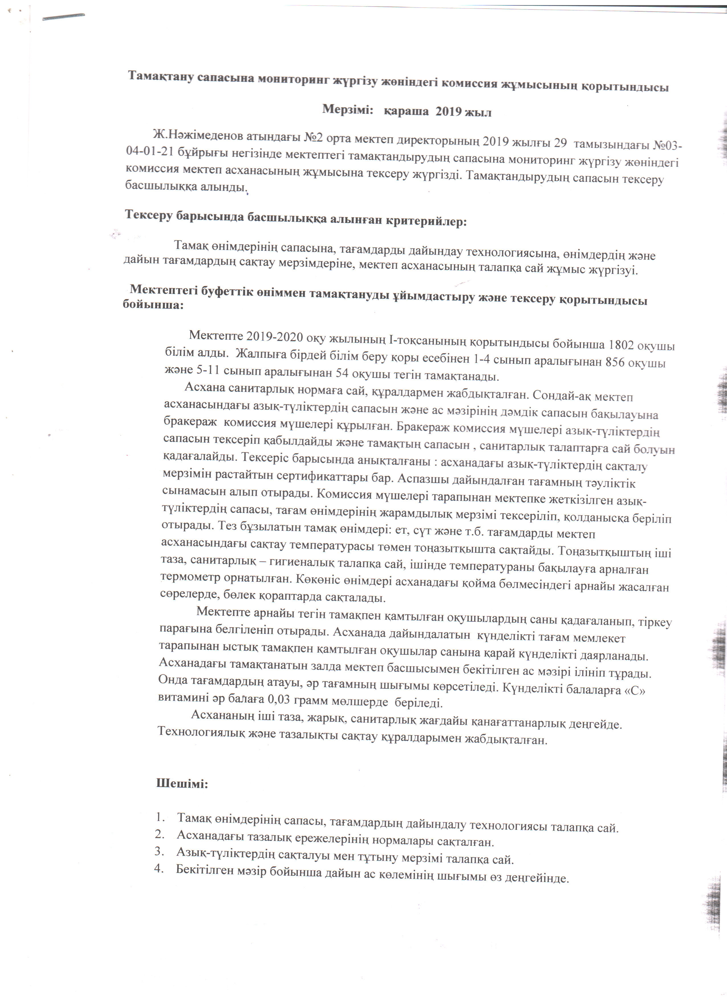 Тамақтану сапасына мониторинг жүргізу жөніндегі комиссияның 2019-2020 оқу жылына жұмыс жоспары
